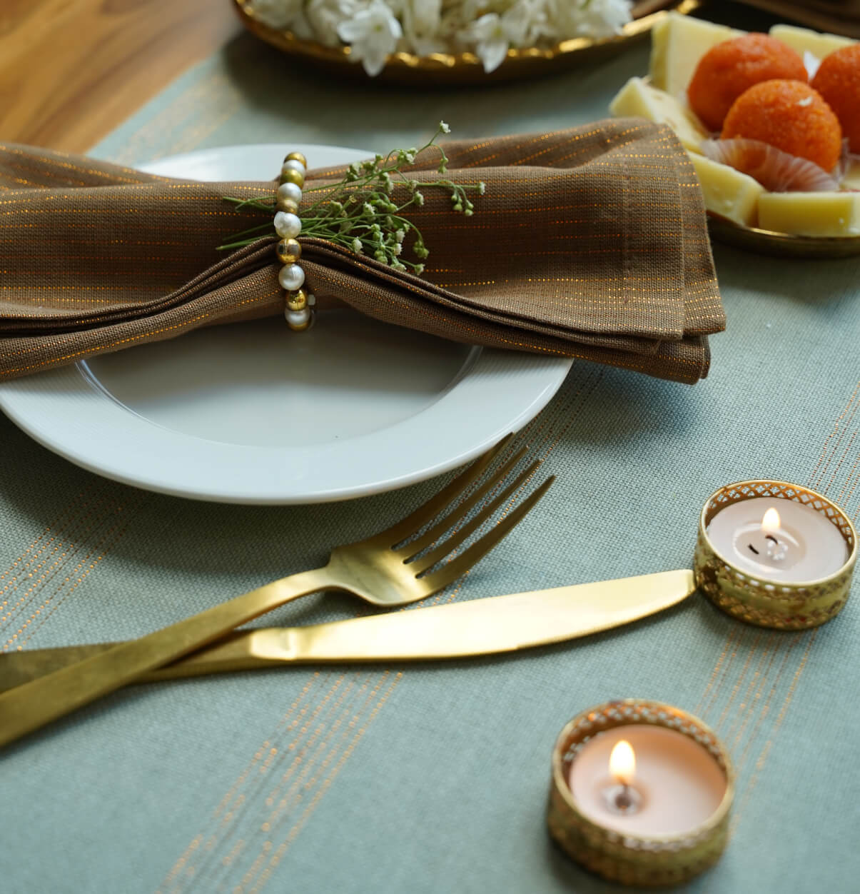 Illuminate your dining table with the refined glow of Zari Stripes Cotton Table Runners — a perfect balance of artisanal craftsmanship and understated festive elegance.
