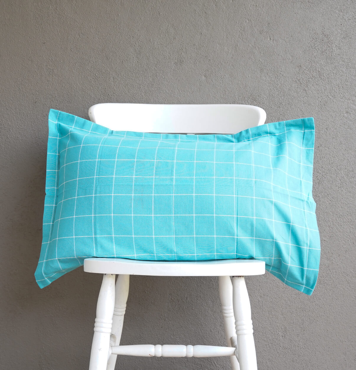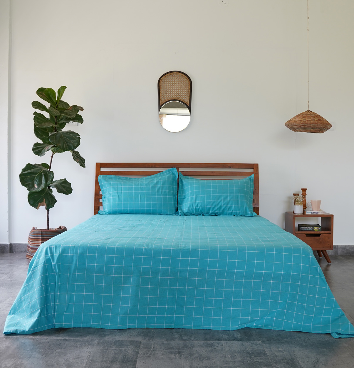 Cotton Bed Sheet – Lagom Chequered – Teal Blue / White – With 2 Pillow Cases